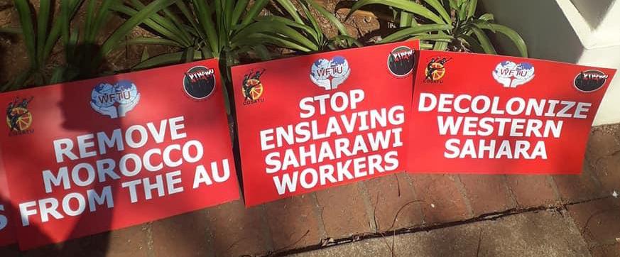 Members of the union gathered dress in their Trade Union’s T-Shirts chanting slogans against the Moroccan colonization of Western Sahara and lifting placards with slogans such as “Remove Morocco from the African Union”, “Forwards with independence of Western Sahara”, “Decolonize Western Sahara”, “Boycott trade with Morocco”, “Free political prisoners” And a number of other slogans.